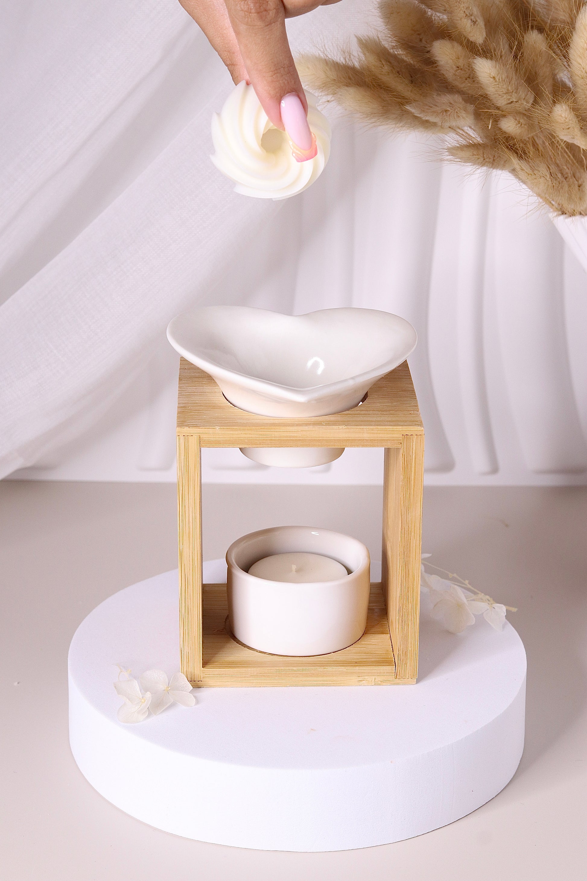 Parfaitement adaptée pour vos cires ou fondants parfumés, senteurs, huiles essentielles ou autres solutions parfumée, la coupelle est indépendante du support et peut donc se nettoyer facilement. La structure en bambou (ignifugé*) apporte beaucoup de cachet à l’ensemble tandis que le support en céramique accueille une bougie chauffe-plat (non fournie).
