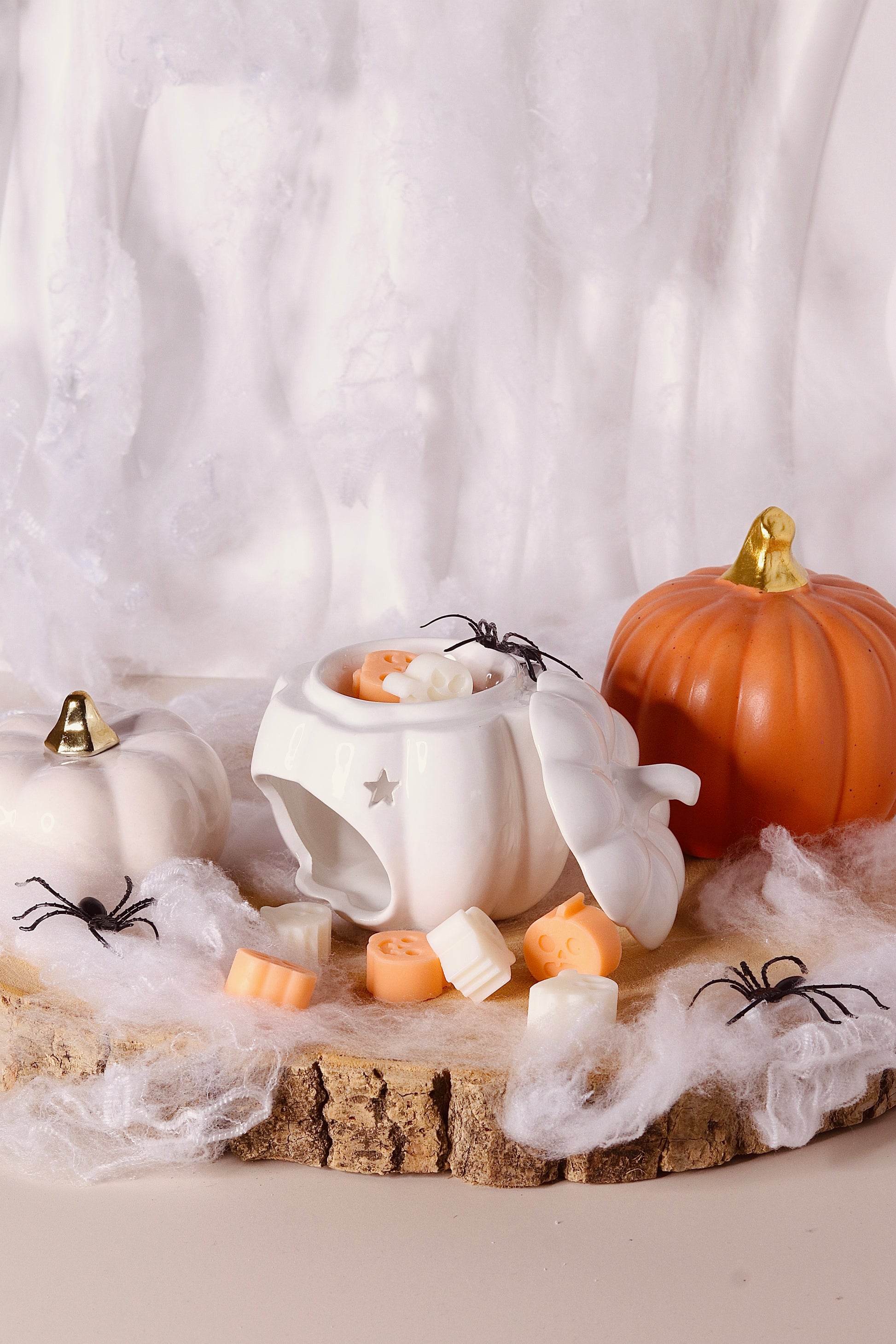 Apportez une touche chaleureuse à votre intérieur cet automne avec un élégant parfum brûle en forme de citrouille blanche. Il vous suffit de placer une bougie chauffe-plat allumée à l'intérieur, de retirer le couvercle, puis d'ajouter votre fondant parfumé automnal dans le bol.