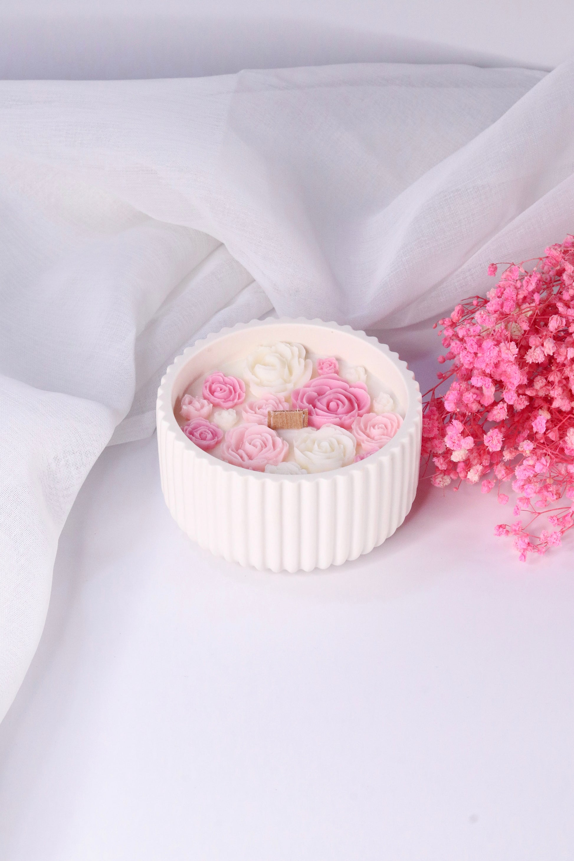 La Floral Garden Rose se compose d’un pot en jesmonite blanc, façonné artisanalement par mes soins, puis garni de fleurs en cire minutieusement sculptées dans des tons rosés et ivoire.