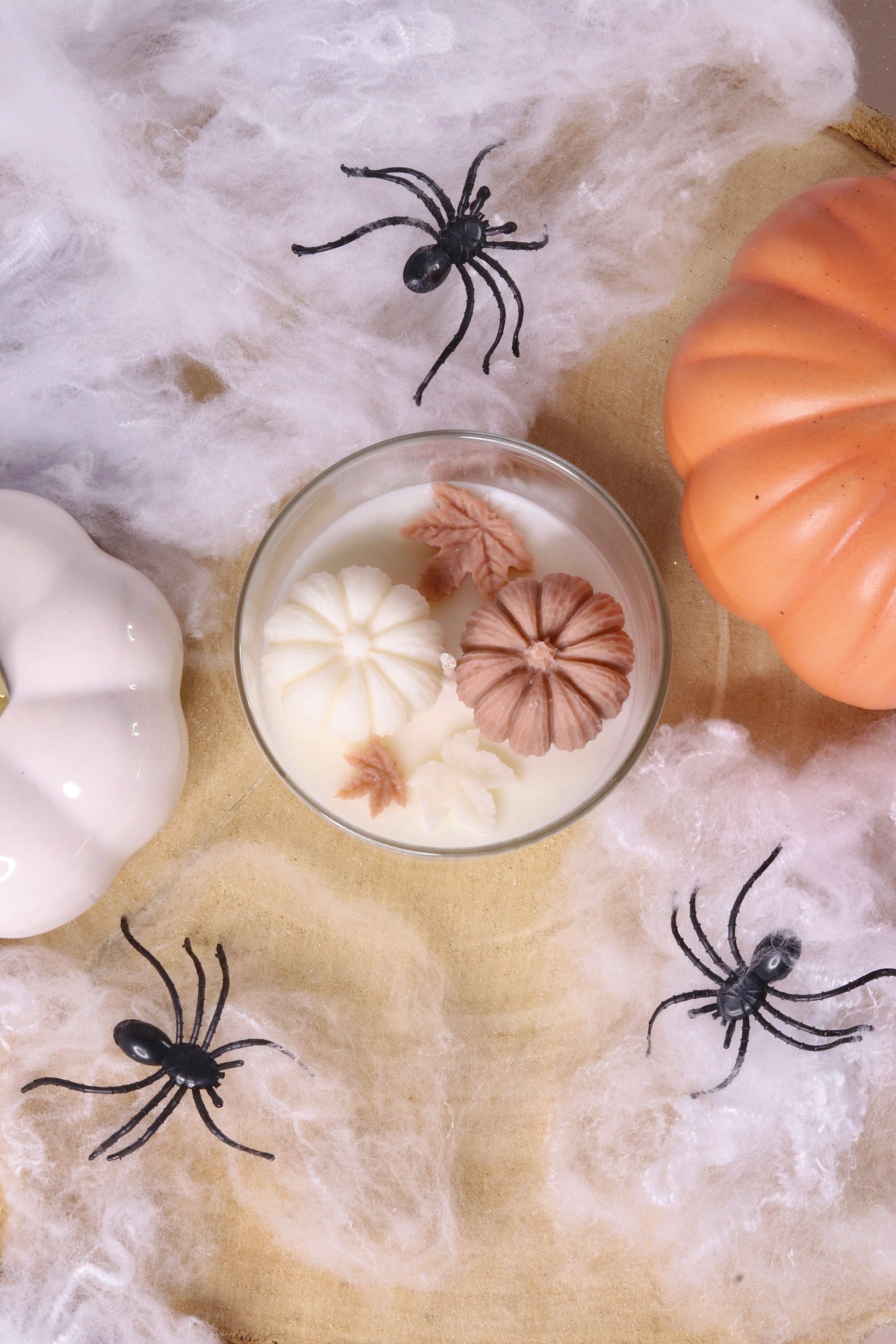 Coulée à la main feuilles dans un verre transparent, cette bougie est ornée de petites citrouilles et minutieusement sculptées en cire , pour un rendu raffiné et unique.
